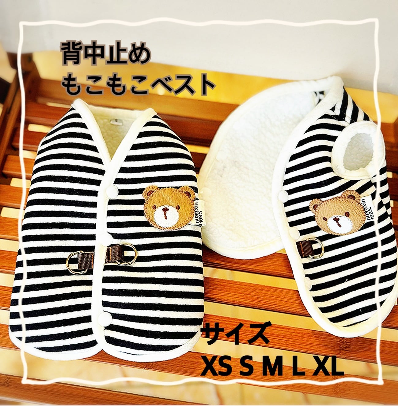 このくまちゃんベストは、しっかりとした生地感と柔らかな肌触りを兼ね備えており、愛犬を快適に包み込みます。また、背中止めのデザインがずれにくく、愛犬が自由に動き回ることができるため、安心して着せることができます!可愛いくまちゃんのデザインが、どんなシーンでも愛犬を一層魅力的に演出します。